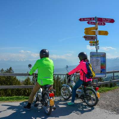 Gemütlich tuckern Sie klimaneutral über verkehrsarme Panoramastrassen, geniessen die herrliche Aussicht, erhaschen da und dort einen Blick auf den imposanten Alpstein und spüren den Fahrtwind im Gesicht. Unterwegs gibt es eine Pause zur Stärkung und dann geht's weiter durch kleine Dörfer inmitten der hügeligen Appenzeller Landschaft. Strecke ca. 44 km : Teufen - Bühler - Trogen - St. Anton - Oberegg - Rehetobel - Speicherschwendi - Speicher - Teufen. Der Ausflug findet bei jeder Witterung statt (ausser bei Schnee). Dem Klima angepasste Kleidung, Sonnenbrille (Helme sind mit Visier), festes Schuhwerk sind nötig. Die Mofas verfügen über Schutzbleche, bei Regen werden Regenponchos abgegeben.